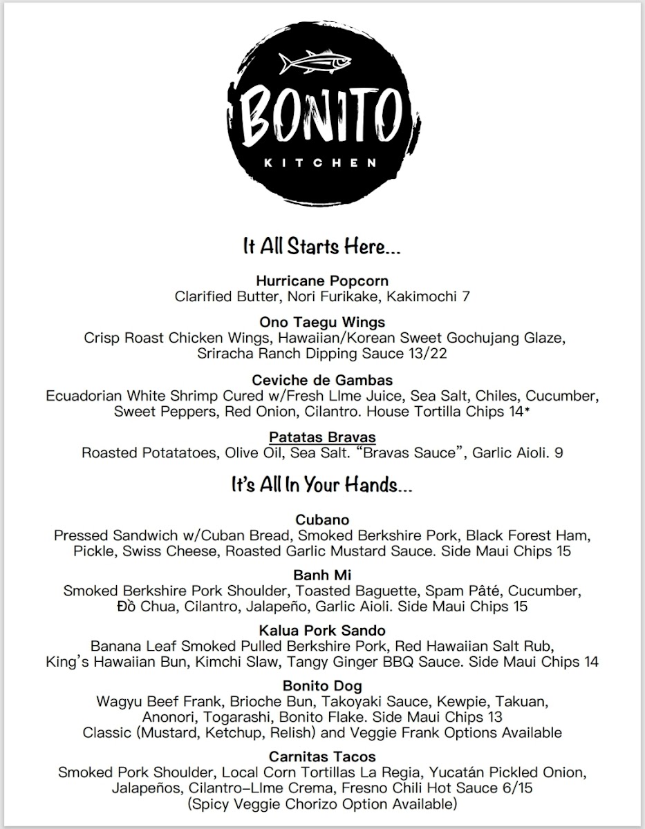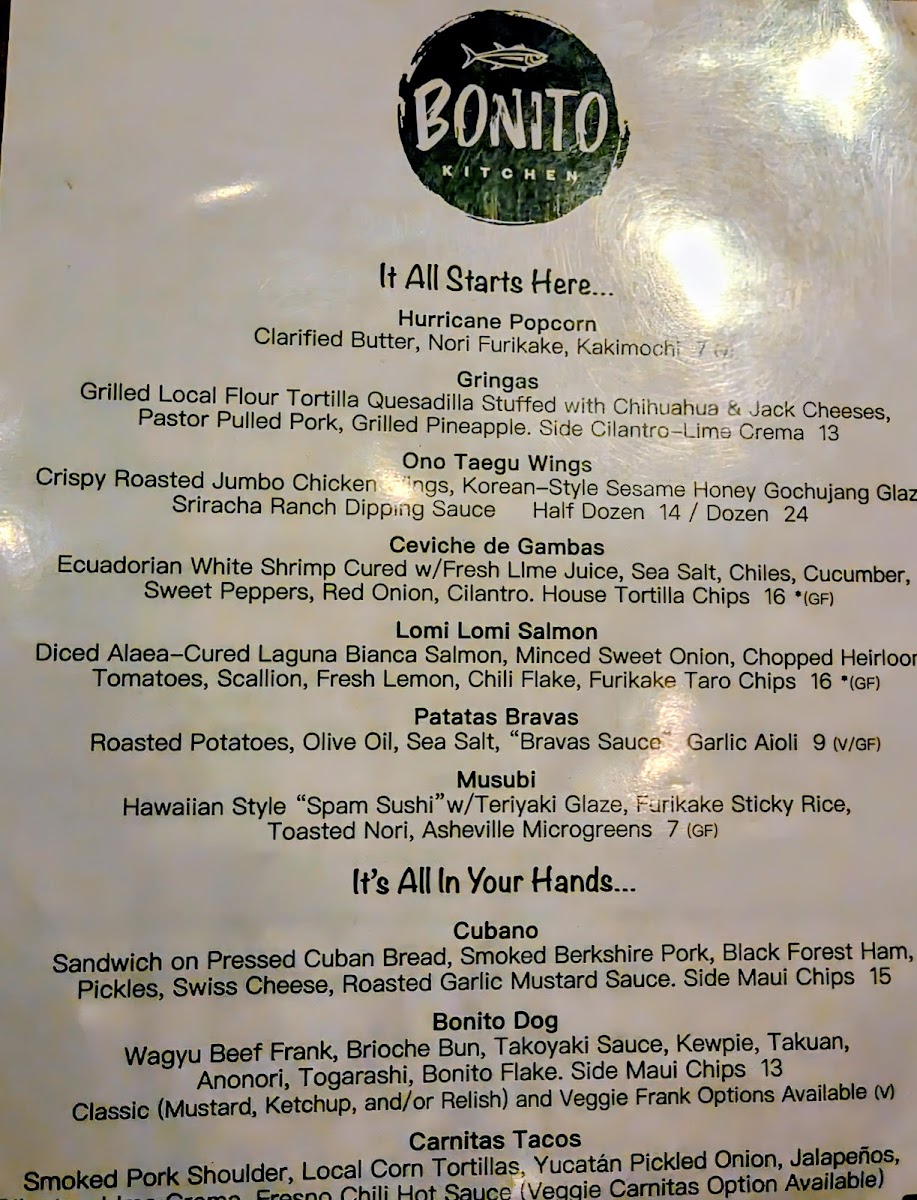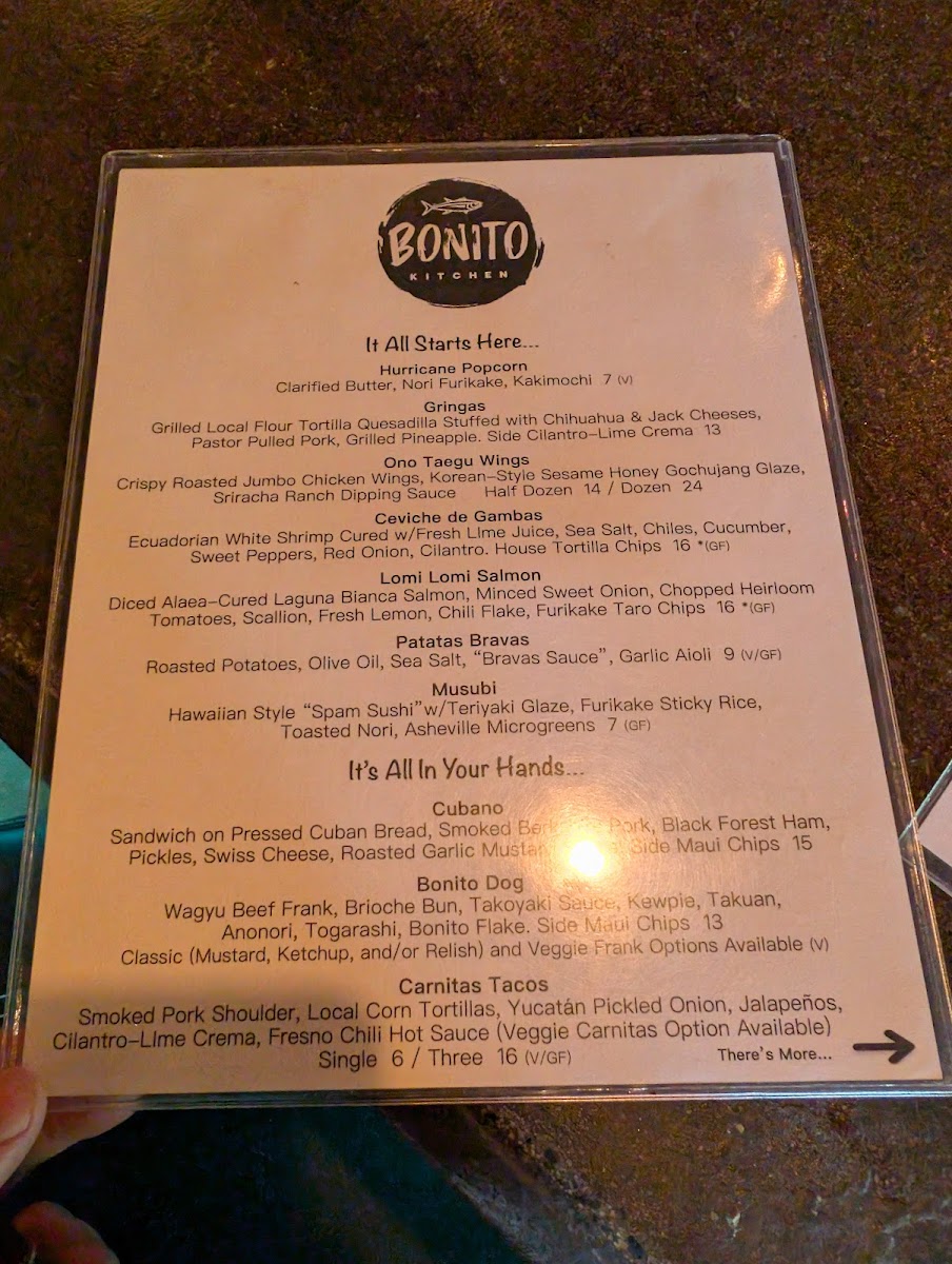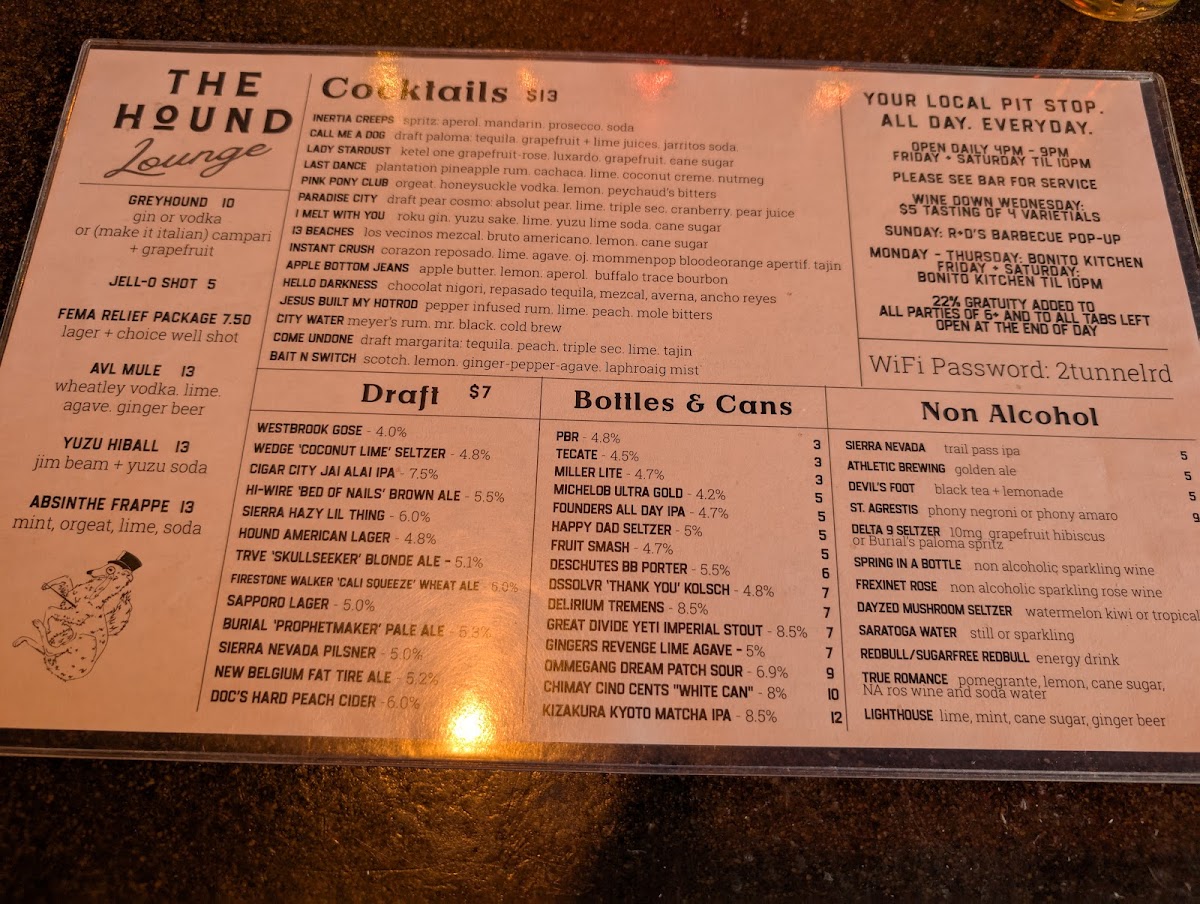 The menu at The Hound in Asheville offers a diverse and exciting array of dishes and drinks that cater to various tastes. For cocktails, standout options include the Inertia Creeps, Lady Stardust, and Last Dance, each offering a unique flavor profile. If you're in the mood for something savory, the Cubano, Bonito Dog, and Carnitas Tacos are delicious choices, each priced reasonably. The draft beers are equally impressive, featuring popular choices like Westbrook Gose, Cigar City Jai Alai IPA, and Sierra Hazy Lil Thing, while the bottled and canned selection includes classics like PBR, Tecate, and Miller Lite, perfect for casual sipping. Non-alcoholic beverages such as Sierra Nevada and Athletic Brewing are also available. For larger meals, the B'stilla, Hawaiian Garlic Shrimp, and Loco Moco are hearty and flavorful. Side dishes like Esquites, Kimchi Slaw, and Moroccan Carrot Salad provide a refreshing complement to the main courses. If you have a sweet tooth, the Mexican Brownie offers the perfect finish. For those seeking something a bit different, there are treats like Hurricane Popcorn, Gringas, Ono Taegu Wings, Ceviche De Gambas, and Lomi Lomi Salmon, ensuring a well-rounded and exciting menu at The Hound.