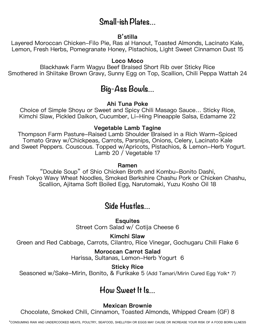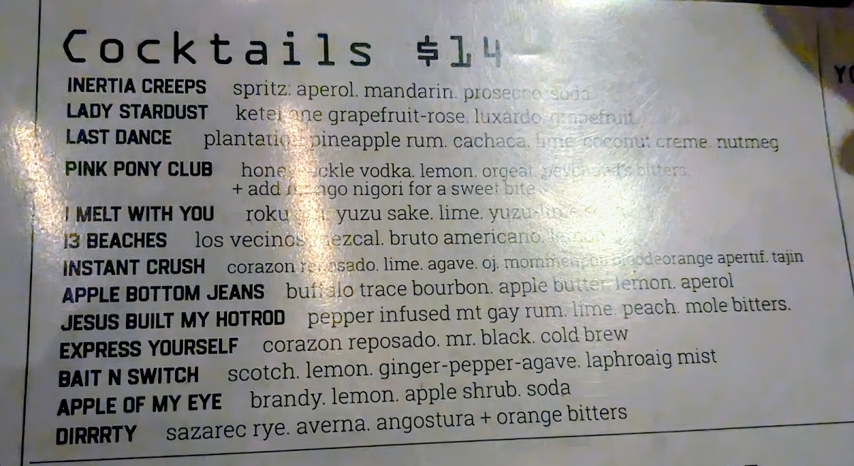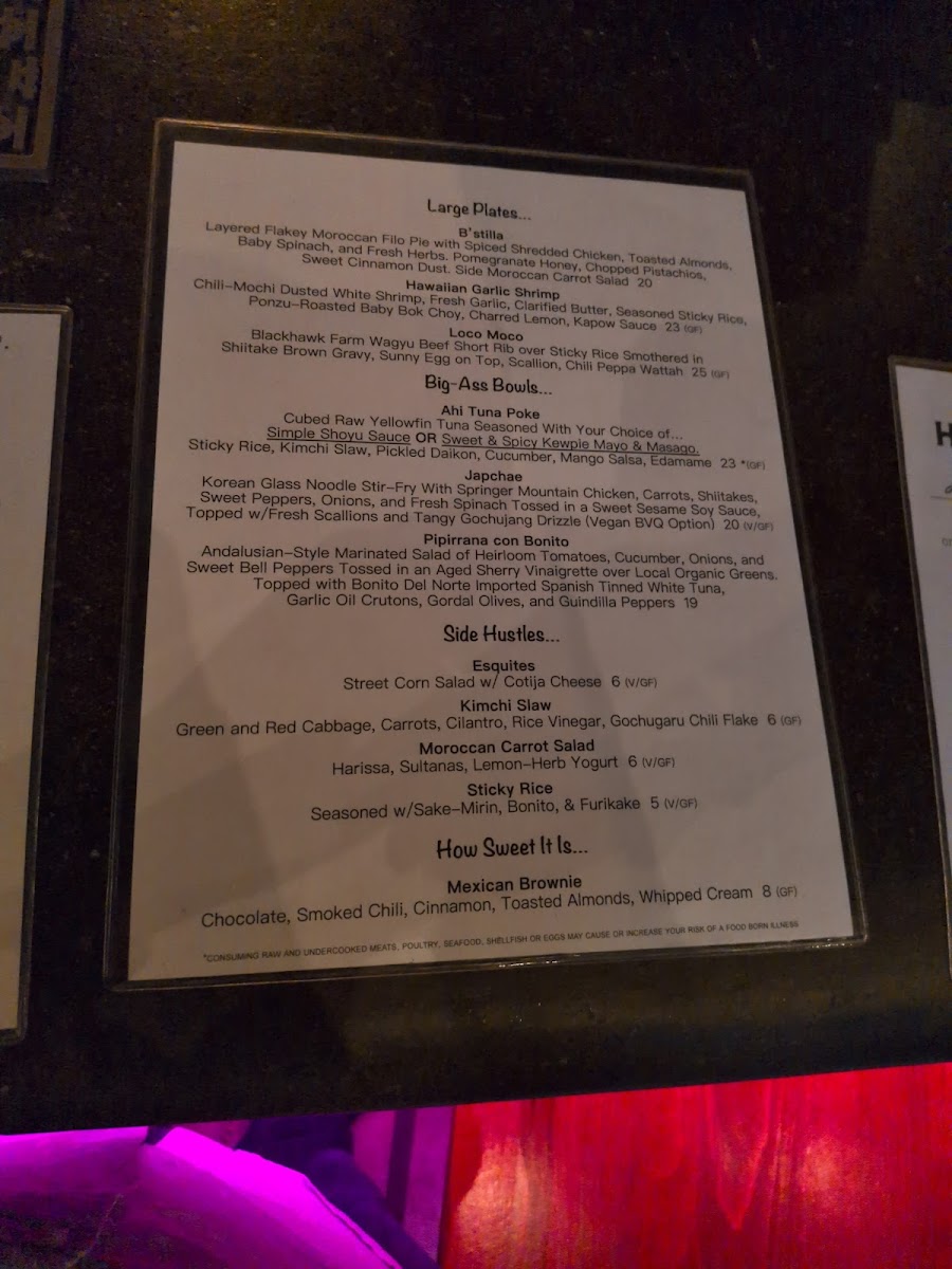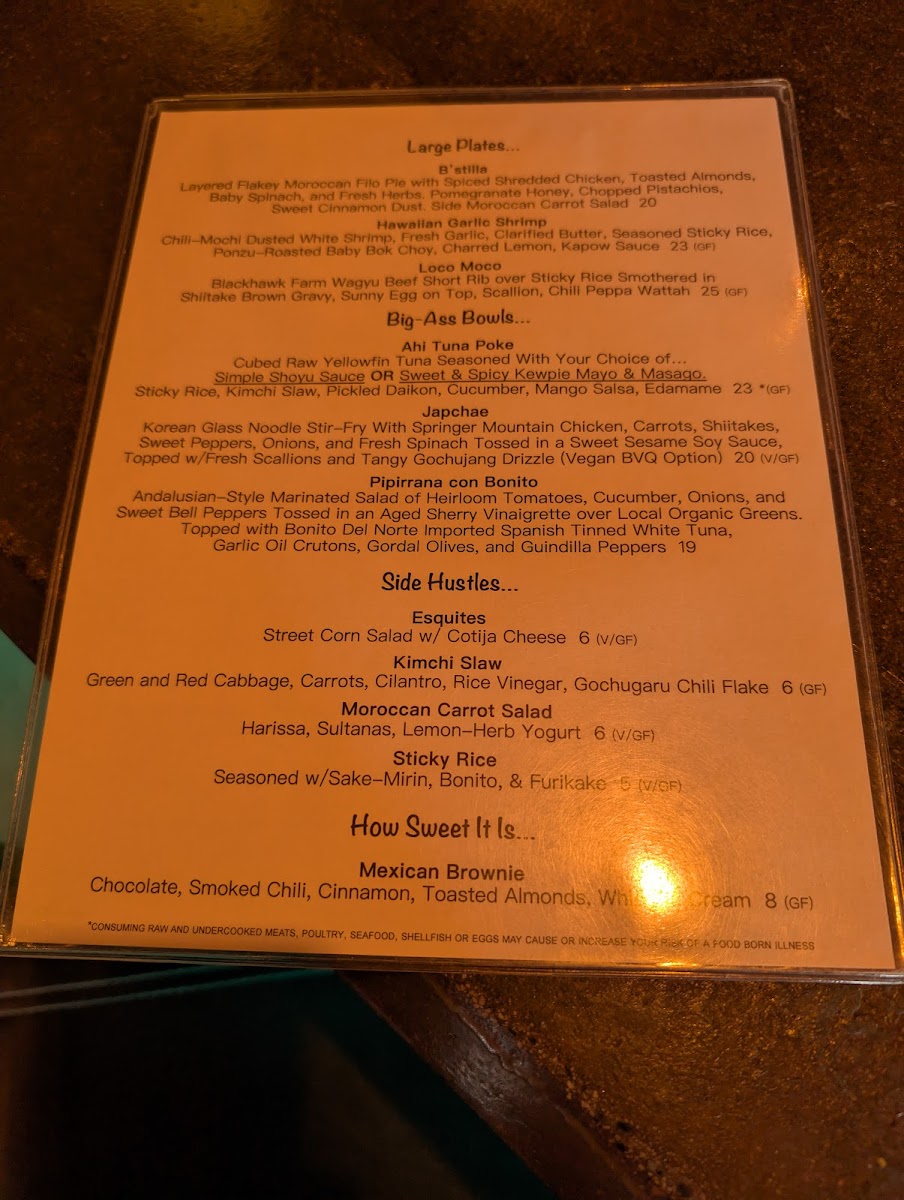 The menu at The Hound in Asheville offers a diverse and exciting array of dishes and drinks that cater to various tastes. For cocktails, standout options include the Inertia Creeps, Lady Stardust, and Last Dance, each offering a unique flavor profile. If you're in the mood for something savory, the Cubano, Bonito Dog, and Carnitas Tacos are delicious choices, each priced reasonably. The draft beers are equally impressive, featuring popular choices like Westbrook Gose, Cigar City Jai Alai IPA, and Sierra Hazy Lil Thing, while the bottled and canned selection includes classics like PBR, Tecate, and Miller Lite, perfect for casual sipping. Non-alcoholic beverages such as Sierra Nevada and Athletic Brewing are also available. For larger meals, the B'stilla, Hawaiian Garlic Shrimp, and Loco Moco are hearty and flavorful. Side dishes like Esquites, Kimchi Slaw, and Moroccan Carrot Salad provide a refreshing complement to the main courses. If you have a sweet tooth, the Mexican Brownie offers the perfect finish. For those seeking something a bit different, there are treats like Hurricane Popcorn, Gringas, Ono Taegu Wings, Ceviche De Gambas, and Lomi Lomi Salmon, ensuring a well-rounded and exciting menu at The Hound.